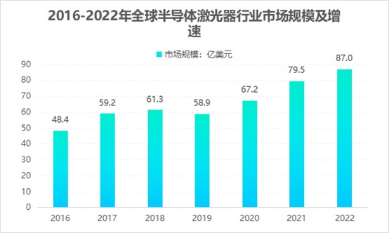 在半導(dǎo)體激光加工應(yīng)用以及中高功率光纖激光器差異需求的推動(dòng)下,具有中高率、高光束質(zhì)量的半導(dǎo)體激光器快速發(fā)展,半導(dǎo)體激光器也成為光電行業(yè)中最有發(fā)展前景的領(lǐng)域之一。數(shù)據(jù)顯示,全球半導(dǎo)體激光器市場規(guī)模穩(wěn)步提升,2021年全球半導(dǎo)體激光器市場規(guī)模達(dá)到79.46億美元,同比增長18.17%。2022年市場規(guī)模約為87.0億美元。